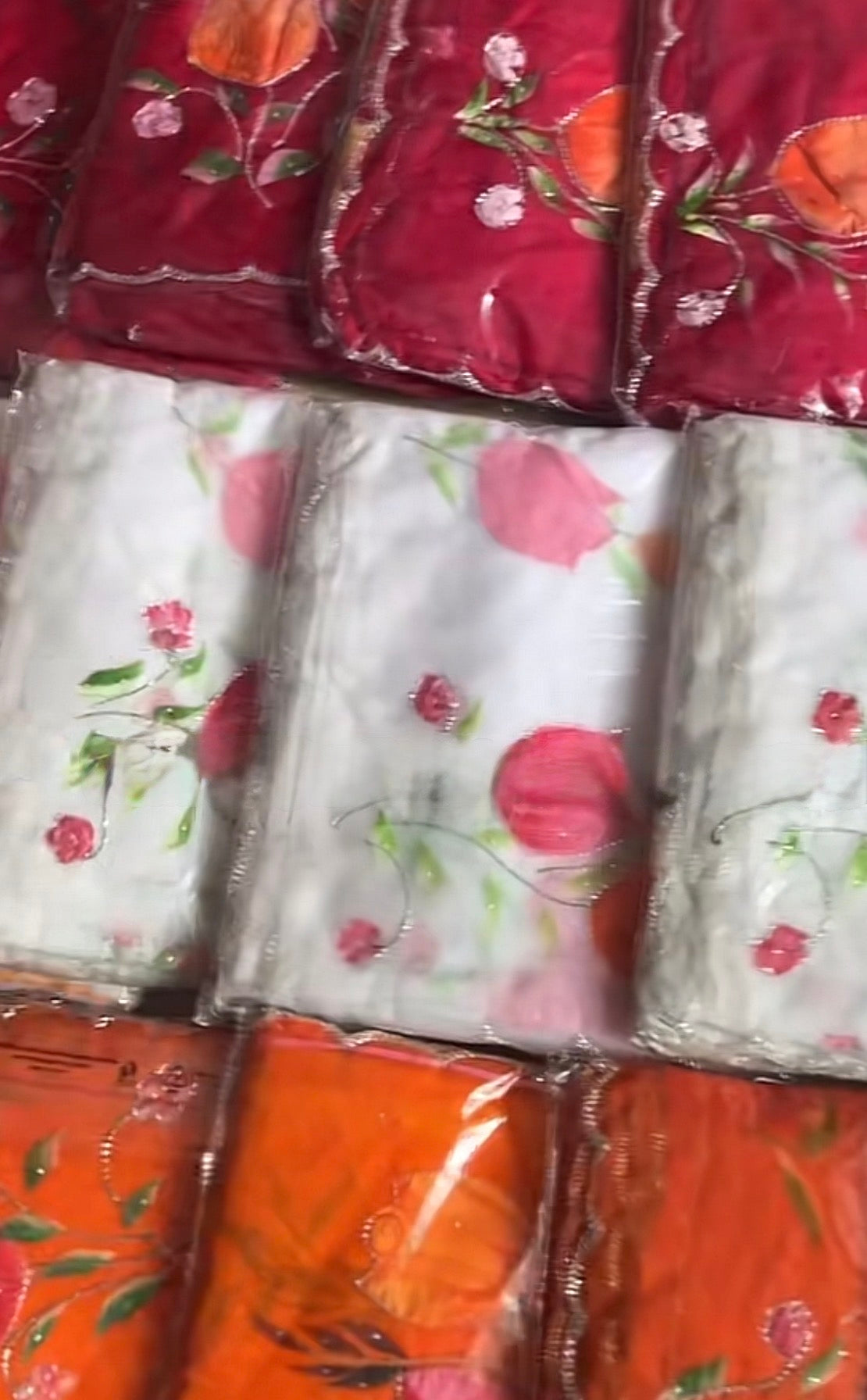 Premium Glass tissue brush printed handwork saree with stiched blouse.